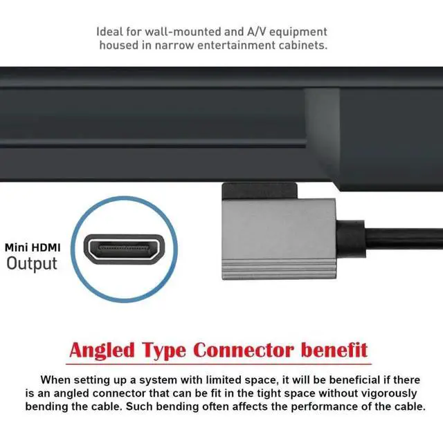 Angled Connector Design: 90 Degree Left Angled Mini HDMI, The angled type Allowing you to connect it to a female port, even if space around the port is limited.