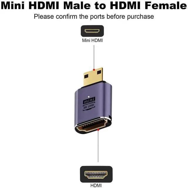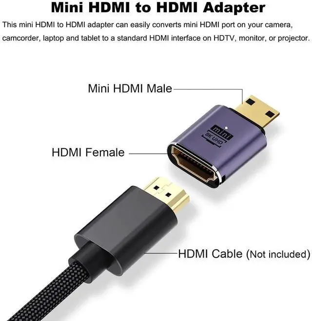 Mini HDMI to HDMI AdapterThis mini HDMI to HDMI adapter can easily converts mini HDMI port on your camera, camcorder, laptop and tablet to a standard HDMI interface on HDTV, monitor, or projector.