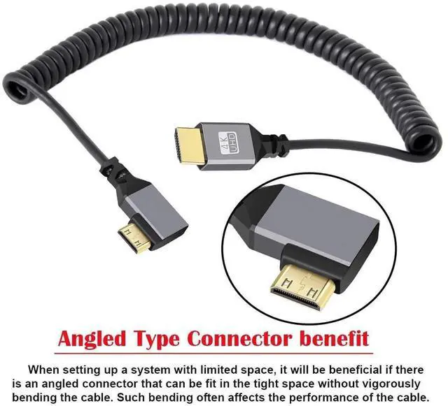 • Mini HDMI 2.0 Male to HDMI Male 4K 60hz Stretch Coiled Cable Left Angled 90 Degree for HDTV Computer Laptop Monitor