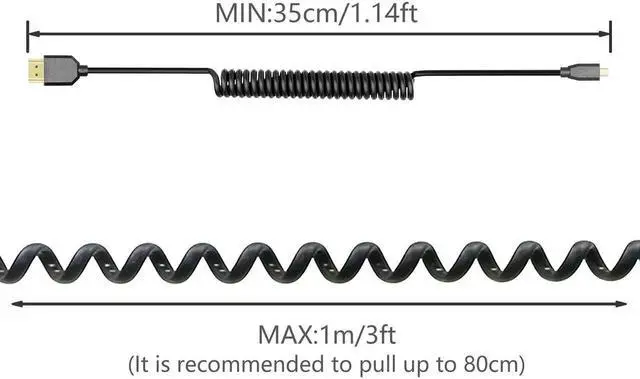 [Coiled HDMI Length]The HDMI cable is coiled to save place, can extend up to 1M/3.3FT. (It is recommended to pull up to 80cm)Gold-plated connectors resist corrosion, provide durability, and improve the signal transmission.