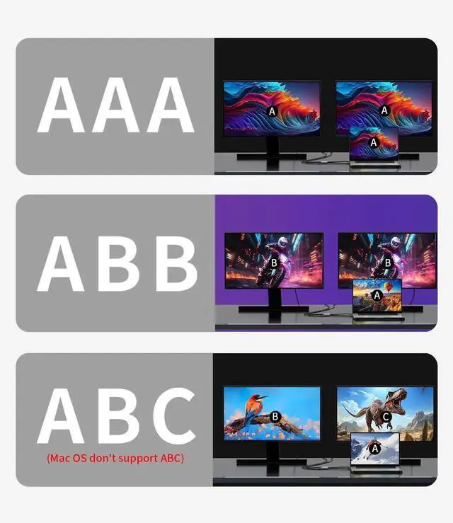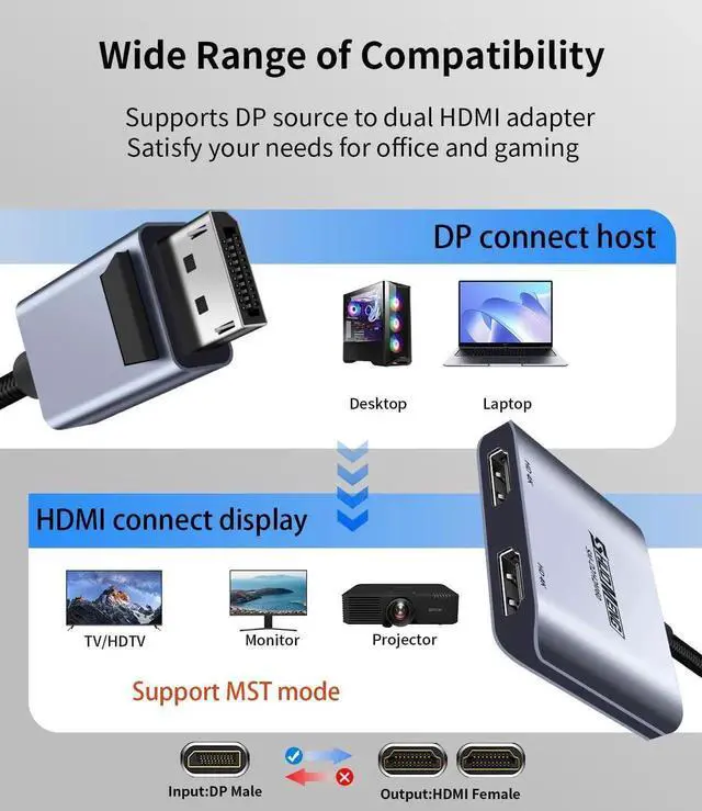 [DP to Dual HDMI Splitter]This DP to HDMI 1 in 2 out adapter can convert the signal of a DisplayPort port into two HDMI signal outputs, support MST. Support both the HDMI Single Stream Transport (SST) mode and Multi-Stream Transport (MST) mode. NOTE: Mac OS only suppors mirroring mode, Not suggest to connect any DP docking or hub, not work with Dell Optiplex 790.