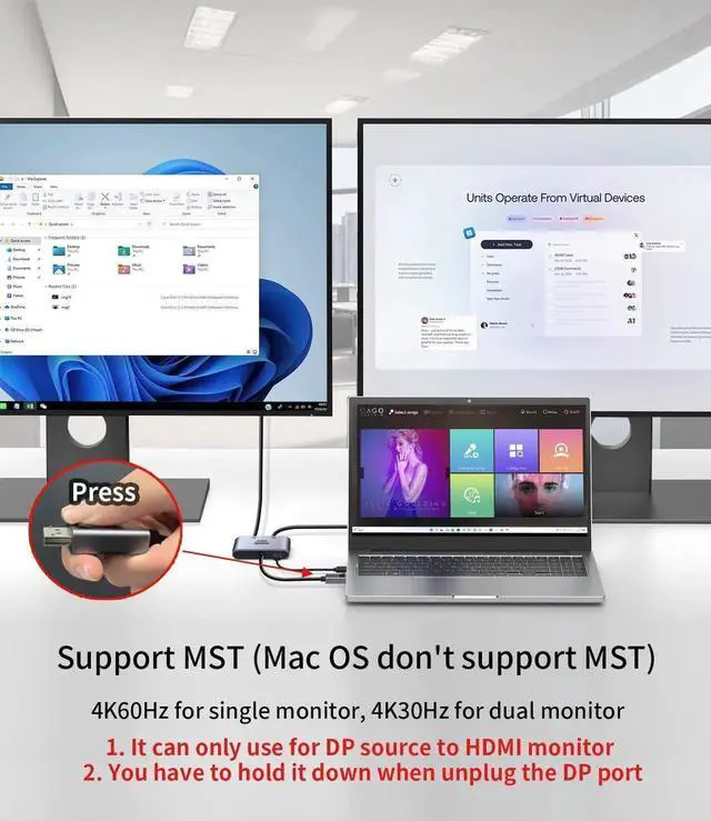 [Note]. The USB cable must be connected prior to use, with a minimum required current of DC 5V/1A, If there is no display, try using an additional adapter to power it. . MacOS doesn't support MST mode, and when for some PC with integrated graphics, only a single screen display is supported. . The DP device's graphics card must support a bandwidth of over 18Gbps. If the display does not work, please update the graphics card driver to the latest version. . It is not compatible with any Hub, Docking Station, KVM Switch, or similar devices, and is only suitable for DisplayPort-enabled graphics cards or laptops.
