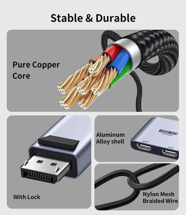 [Perfect Design]Nylon braided cable, integrated aluminum alloy shell design, nylon braided cable can increase service life and prevent cable damage caused by scratches, integrated aluminum alloy shell can give full play to the advantages of heat dissipation. Adapter cable is 60cm long, enough to cope with various usage scenarios. DP port with lock, it makes the connection more stable and will not come off, but you have to hold it down when pulling it out.