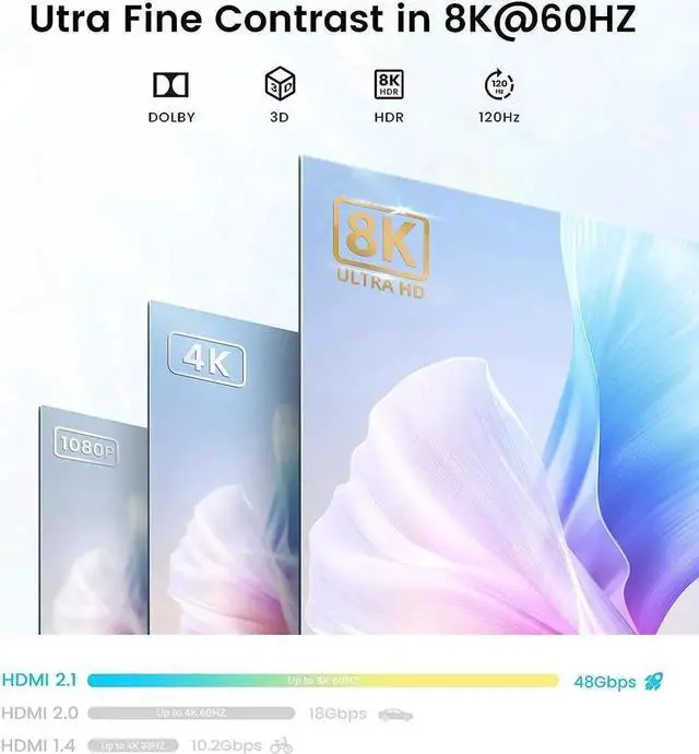 8K@60Hz Ultra-High-Definition: Support 8K@60Hz, 4K@144Hz/120Hz/60Hz, 1080P@240Hz resolution and HDMI 2.1 back forward compatible. Plus VRR, Dynamic HDR, HDCP 2.3 and transfer rates up to 48Gbps. Delivers a super-immersive viewing experience.