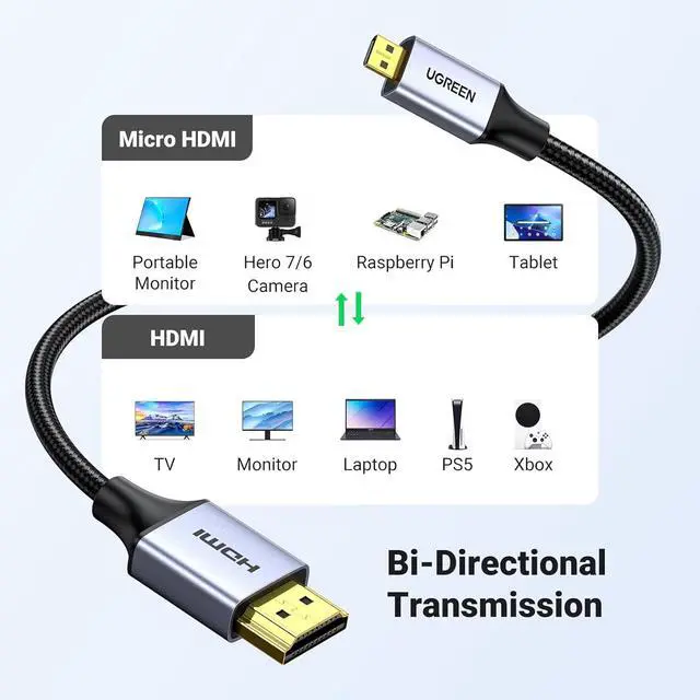 Stunning 4K@60Hz HD: Immerse yourself in breathtakingly clear and ultra-high-definition video with 3D Technology with this UGREEN Micro HDMI to HDMI cable, supporting 4K@60Hz, 2K@165Hz Full HD resolution, 18Gbps transmission speed and Audio Return Channel offers with uncompressed multichannel digital audio. *Please pay attention to the interface of your device, micro HDMI port NOT mini HDMI or micro USB