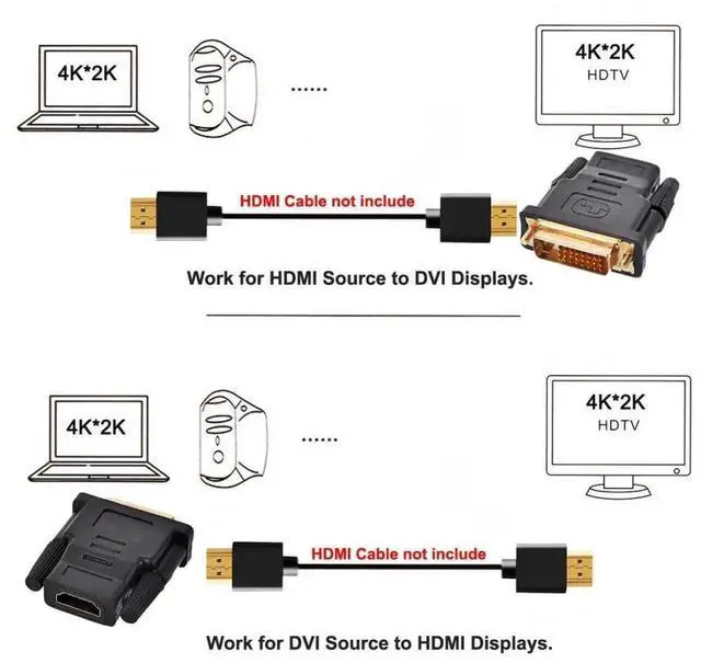 1) The HDMI-DVI bi-directional adapter can connect a computer with a DVI port to a monitor, HDTV, or projector with an HDMI port, or connect a computer with an HDMI port to a monitor with a DVI port.