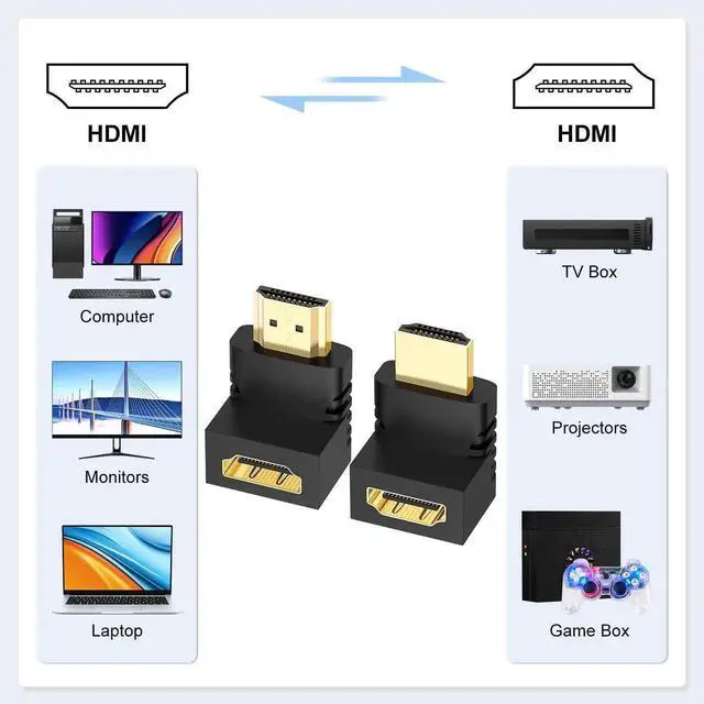 2 pack includes one 90 degree and one 270 degree male to female HDMI adapter with a short body, connecting devices for optimal settlement without bending the cable, especially in tight fit situations