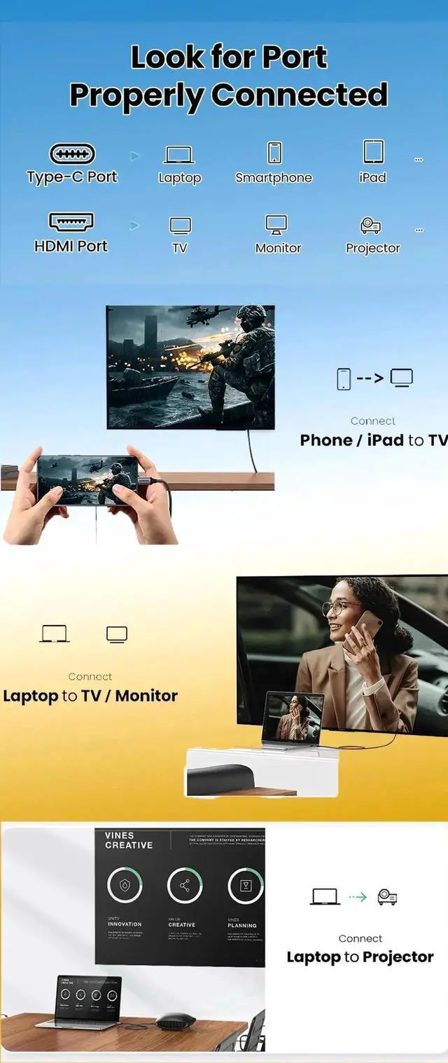 Big Screen Viewing - Phone to TV: The USBC to HDMI Cord makes it easy to connect your Android phone to a TV/projector equipped with an HDMI port. This allows you to enjoy live events or your favorite shows on a larger screen. A direct HDMI cable from your phone to your TV means no more worrying about unstable Wifi. Stable signal transmission ensures even and clear picture quality. *Note: Only Android phones with video output are supported