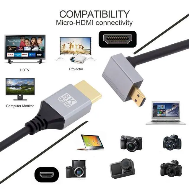 Vszerda HDMI 2.1 Cable,HDMI Male to Micro HDMI Male 90 Degree Down Angled 8K@60Hz 4K@120Hz 48Gbps Ultra High-Speed Gold-Plated Cable 1.64FT/0.5M for TV, Monitor, Computer