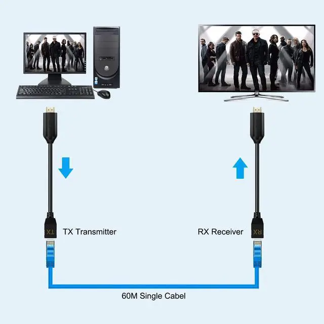 3.Connect a single cat-5e / 6 ( recommended ) cable up to 60 meters between TX and RX Extender.