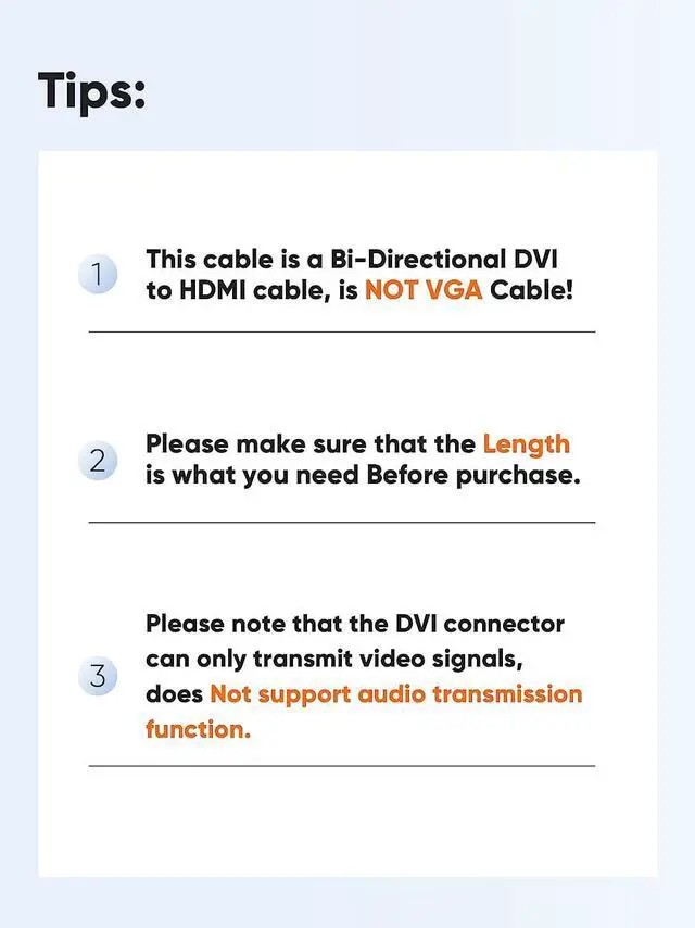 1. This cable is a DVI to HDMI cable, is NOT VGA or DP Cable!! Please confirm the required interface before purchase.