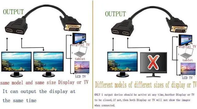 Special Note: This cable is one DVI 24+1 to two hdmi Splitter Cable, because there is no built-in chip, you can simultaneously while the two monitors, but the same model and the size of the same size can be displayed at the same time! Otherwise, only one display is used and the other is turned off. Use it as a toggle switch. You can not turn on both monitors at the same time, and both monitors will not have an image. This product can act as a signal router, for example, you may have a TV in two separate rooms, you can have a TV on in one room and when you want to switch room and keep watching the TV, you just need to switch one TV off and switch the other TV on, and then the signal is routed to the TV in the other room.