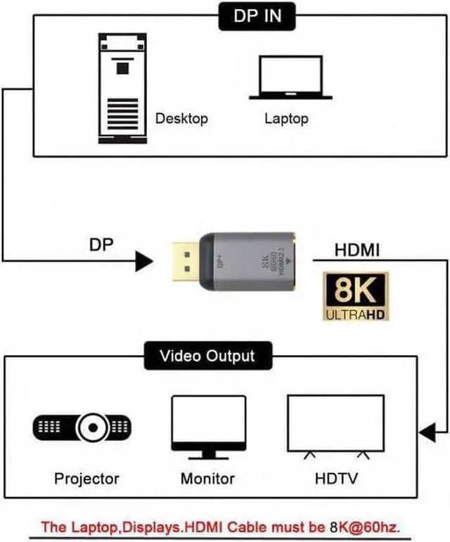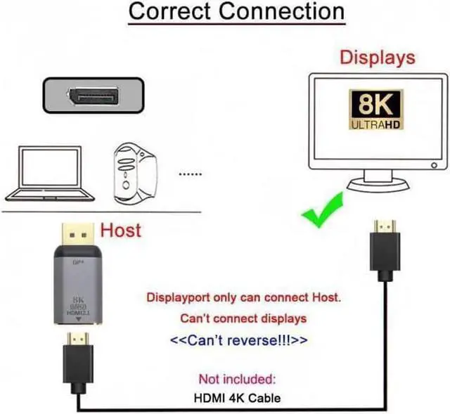 • This is a 8K DisplayPort to HDMI adapter, Don’t support HDMI to DP. It is not Bi-directional.