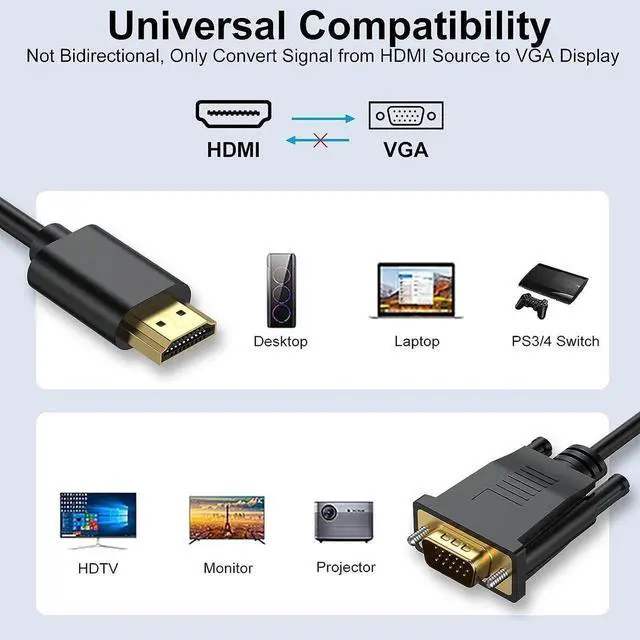 Uni-directional HDMI to VGA Cable Built-in advanced IC chip converts convert digital HDMI signal to analog VGA signal Transmits high-definition video from your computer to a monitor for video streaming or gaming; Suitable for Extended Desktop or Mirrored Displays. Plug & Play Easy to use just plug and play no extra driver or software installation needed. 1080P High Resolution The HDMI Male to VGA Male Adapter supports video resolution up to 1920x1080@60Hz (1080p Full HD) including 720p 1600x1200 1280x1024 for high definition monitors or projectors. Borad Compatibility This HDMI to VGA cord compatible with computer pc desktop laptop ultrabook notebook Chromebook Raspberry Pi Intel Nuc Roku PS3 Xbox One Xbox 360 Wii U Set Top Box TV BOX or other devices with HDMI port.