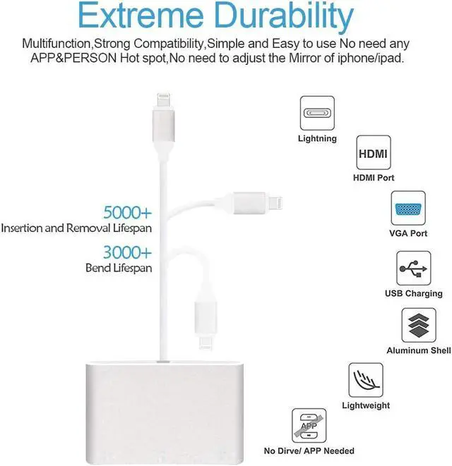 2.Connect lightning port to your iPhone/iPad, HDMI or VGA interface to HDMI or VGA equipped display.