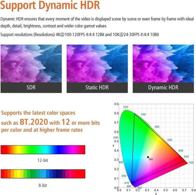 Dynamic HDR Dynamic HDR ensures every moment of a video is displayed at its ideal values for depth, detail, brightness, contrast, and wider color gamuts on a scene-by-scene or even a frame-by-frame basis