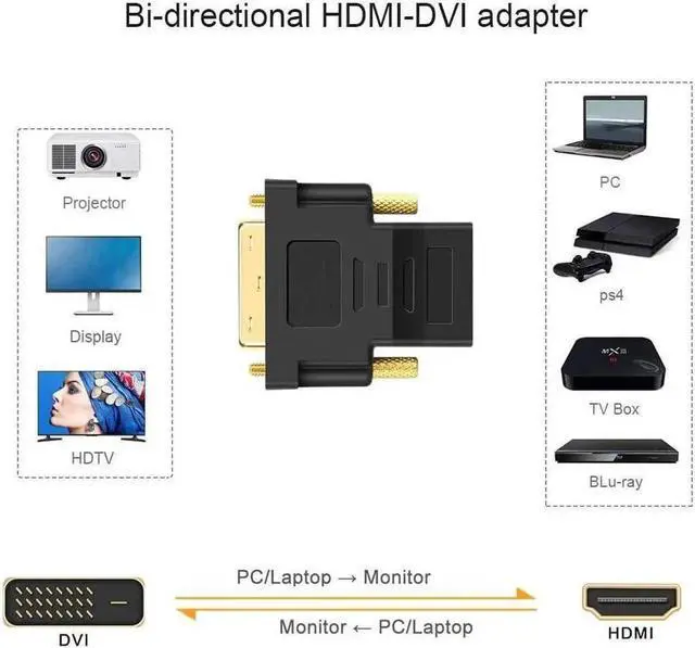Bi-directional Design- Can be connected from a computer with DVI port to a monitor HDTV or projector with HDMI port or from a computer Blu-ray player TV box or game console with HDMI port to a monitor with DVI port. A HDMI cable (sold separately) is requiredHigh Quality- 24K Gold-plated connectors resist corrosion and oxidation ensures stable and secure connections. High grade PVC molding endows the adapter with excellent anti skid property make the product wear-resistant and drop-resistant suitable for long-term useMaximum Resolution- Supports resolution up to 1080p (Full HD). Audio must be transmitted separatelyCompact Size- The portable size and light weight is perfect for home and travel use as well as for office monitors or projector connectionPlug and play- Easy to use no extra drivers needed.