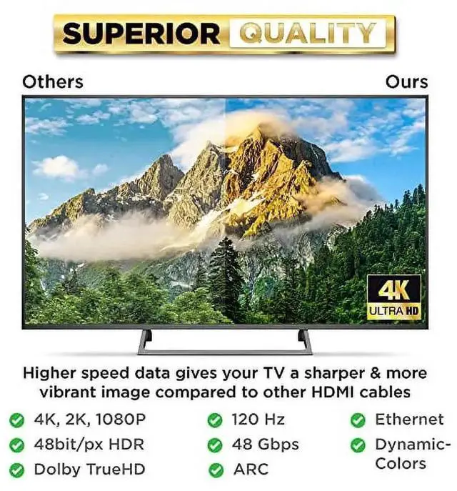 Additional Features- HDR and HDR10 for Dolby version support ensures every moment of a video is displayed at its ideal values for depth, detail, Brightness, contrast and wider color gamut on a scene-by-scene or even a frame-by-frame basis. High speed and transmission stability---48 Gbps/ 8K video at 120 Hz, 2160p, 1080p, 48 bit deep color.