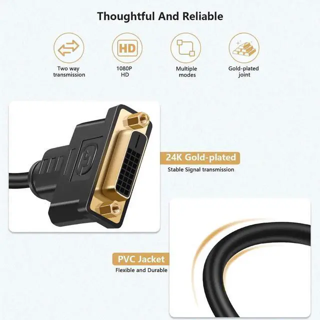 Soft PVC Wire Body: This DVI-D to HDMI Cable Female to Male is made high quality copper cores, gold-plated connectors and flexible soft PVC jacket materials, wear-resistant and tensile, and durable, and not easy to break.