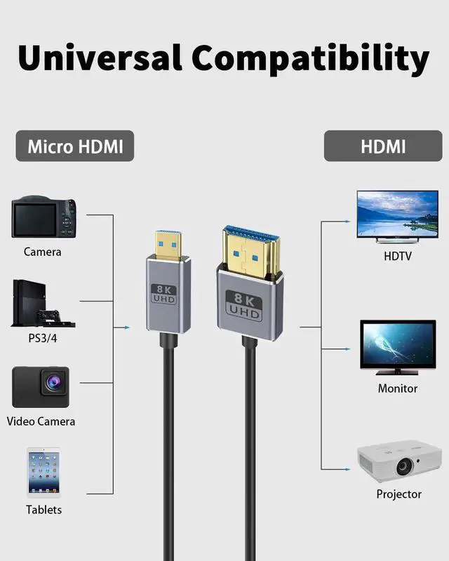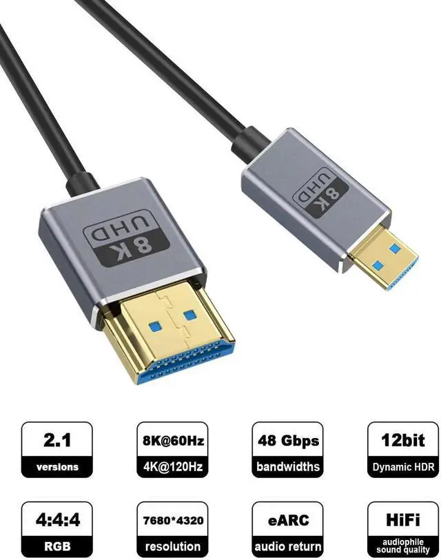 Ultra-Thin Micro HDMI Cable: This ultra-thin HDMI 2.1 cable features a 2.5 mm diameter and a shielded core of only 1.87 mm, making it easy to bend and highly adaptable to devices. It is more environmentally friendly, offers higher elasticity, and is less prone to tangling and breakage. Our coaxial cable is "thinner, softer, and easier to store" while providing "ultra-stable, " "ultra-high-definition, " and "ultra-fast" performance.