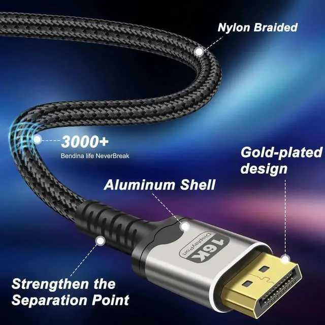 16K DisplayPort cable connects the latest computers and monitors, expanding workspace and multi monitor configurations, with high resolution and refresh rate, plug and play, making it perfect for gaming and ultra high definition video streaming;
