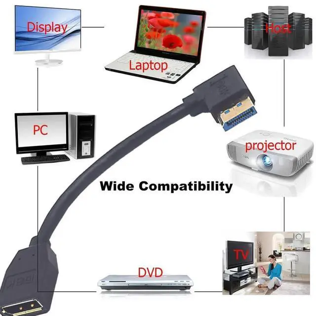 - Angle support. The 90-degree DP 1.4 version adapter cable can help you solve difficult work scenarios, such as connection in a small space, avoid the bending of the cable connection port to affect the output, and make our right-angle end output easier. Before purchasing, please carefully choose the angle you need to avoid unnecessary trouble.