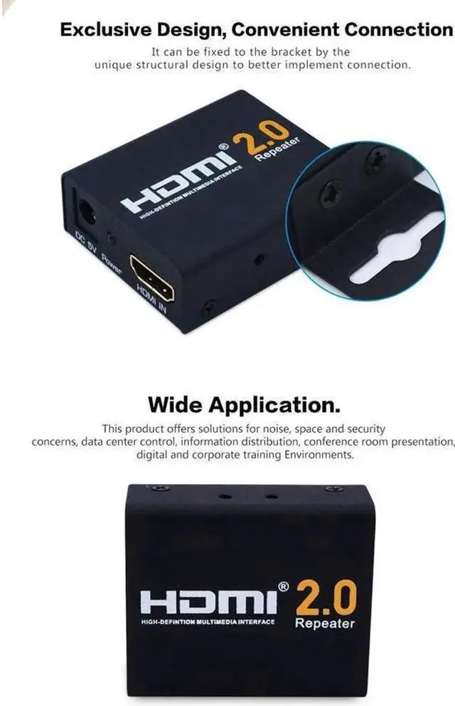 Product Description: This super-mini HDMI repeater is designed to create a new standard HDMI signal by decoding and re-encoding and to regenerate long-distance, lossless HDMI signals. Features l Support HDMI 2.0 and backward compatibility l Serial data rates up to 6.0 Gbps, support for resolutions up to 4K / 2K @ 60Hz l support HDCP 2.2 l support 3D transmission l Input resolution 4K / 60Hz, RGB