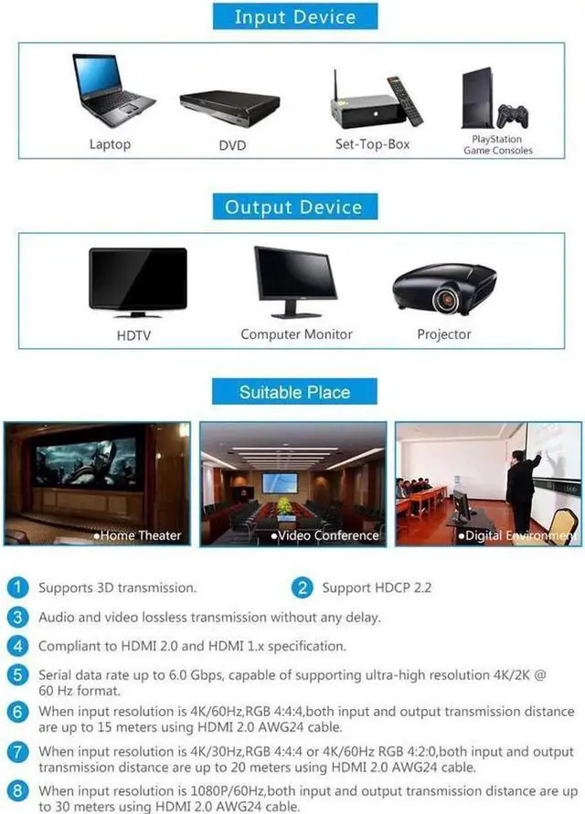 RGB 4: 2: 0 with standard HDMI 2.0 version, AWG24 cable, input transmission distance up to 20 meters, output transmission distance up to 20 meters l Input resolution is 1080P / 60Hz, using standard HDMI 2.0 version, AWG24 cable, the input transmission distance up to 30 meters, the output transmission distance up to 30 meters l audio and video lossless without delay transmission l Installation is simple