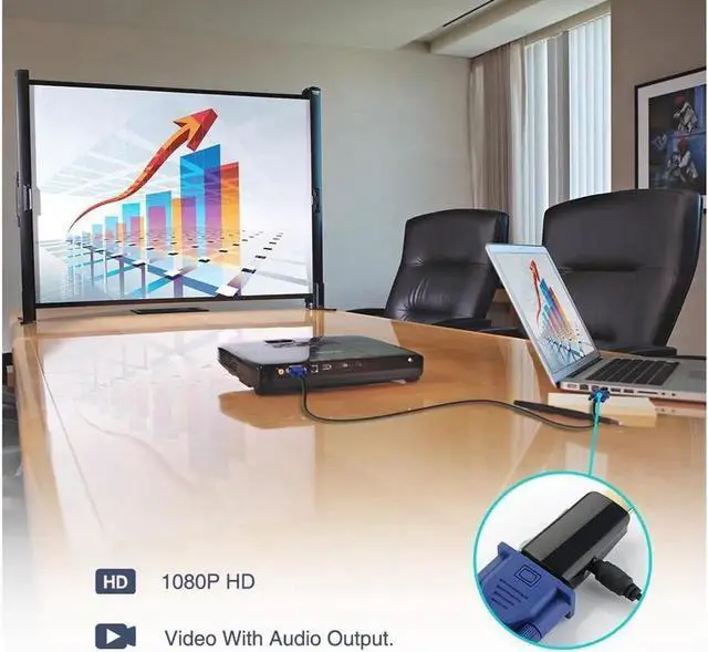The HDMI-compatible to VGA converter supports resolution up to 1920x1080 (1080p Full HD) including 720p and 1600x1200 for HD monitors or projectors.
