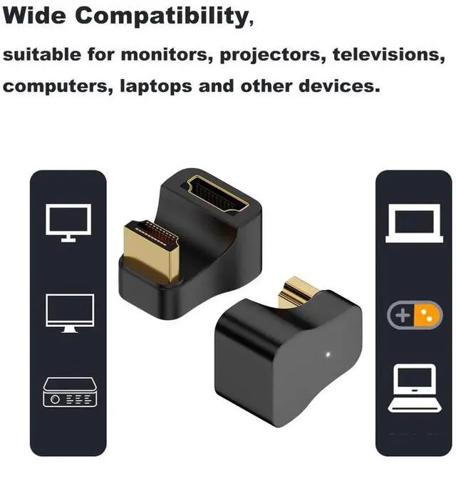 - Angle support. The 90-degree HDMI coupler is specially designed for wiring needs in special venues, such as narrow spaces and corners. It can also effectively prevent the bending of port cables from affecting the picture output, making our game and cinema output more relaxed and smooth. Before purchasing, please carefully choose the angle you need to avoid unnecessary return troubles.