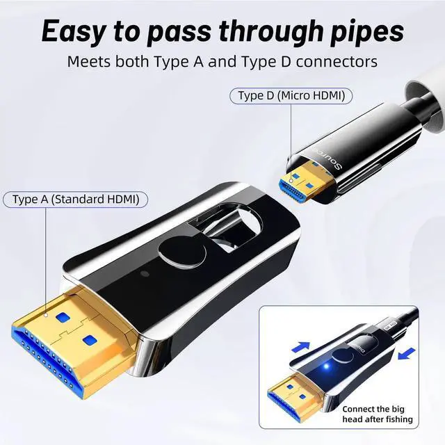 • [Fiber Optic HDMI Cables for Pipes]The 8K fiber optic HDMI 2.1 cables are epecifically for install HDMI cables in wall by pipes, has a detachable connector that can be turned into a smaller micro connector, can easily pass through pipes.