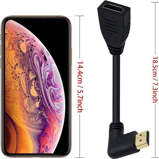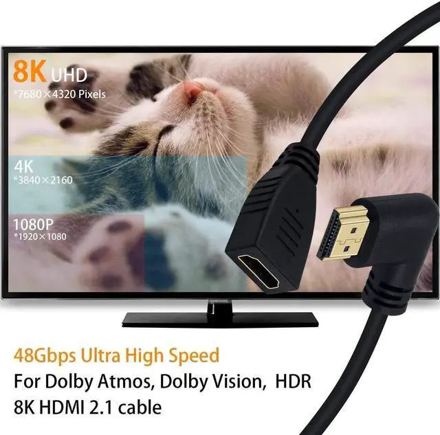 This 8K HDMI 2.1 left-angle extension cable features a 90° male-to-female design to solve tight-space connection issues behind TVs, monitors, and game consoles. Engineered with 48Gbps ultra-high-speed bandwidth, it supports 8K@60Hz, 4K@120Hz, Dynamic HDR, HDR10+, Dolby Vision, 3D video, and eARC lossless audio. Gold-plated corrosion-resistant connectors guarantee stable transmission with zero signal degradation. Measuring 0.5 feet, it keeps your setup tidy while fully compatible with Samsung, LG, Sony, TCL, Hisense, Roku, Xbox Series X/S, PS5, PS4, Nintendo Switch, laptops, projectors, and Blu-ray players. Perfect for home theater, gaming, and wall-mounted installations.