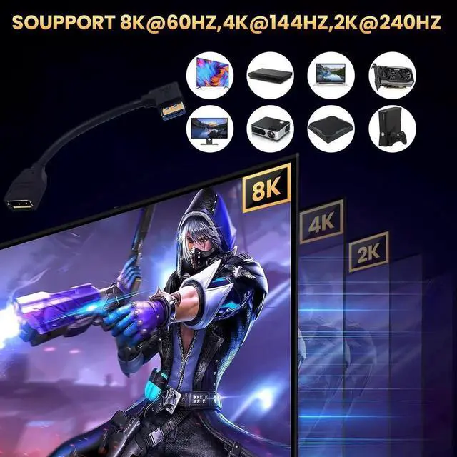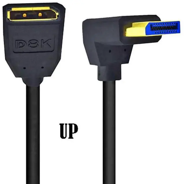 This 5.9-inch DisplayPort 1.4 extension cable uses a 90° upward angle connector to fit narrow spaces behind monitors, PCs, and wall-mounted setups. It supports ultra-high-definition 8K@60Hz and high-refresh 4K@144Hz for gaming and professional display. Gold-plated contacts and multi-layer shielding ensure stable, clear signal transmission. The short length keeps your setup tidy while extending your DP port safely.