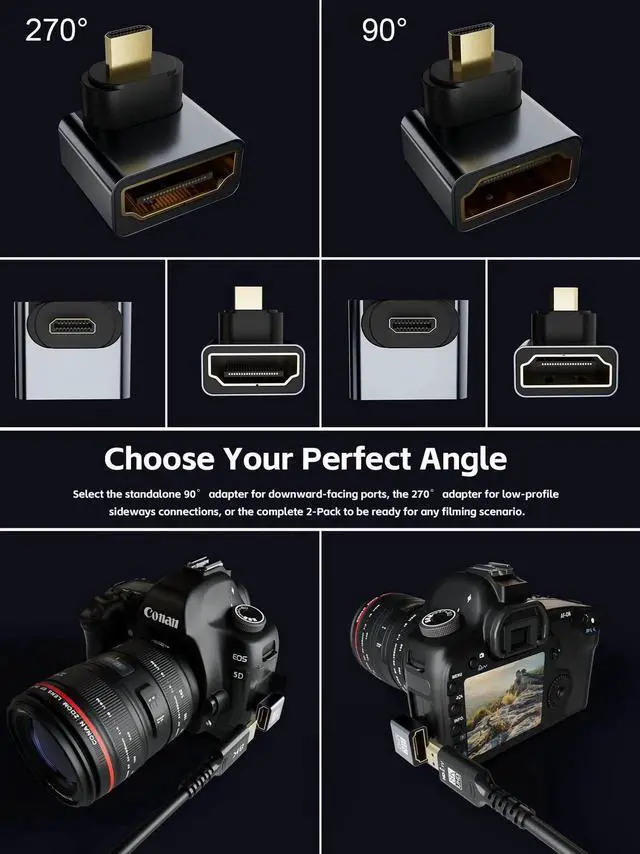 This 90-degree right-angle Micro HDMI adapter supports ultra-high-definition 8K@60Hz and 4K@120Hz video transmission, meeting the demands of high-quality imaging and display. Its angled structure effectively relieves port pressure and fits compact equipment installation. The male-to-female fixed design provides solid connectivity without loosening. Gold-plated connectors and multi-shielding ensure stable, interference-free signal transmission. Ideal for use with cameras, camcorders, tablets, monitors and other devices with Micro HDMI ports for photography, live streaming and display extension.