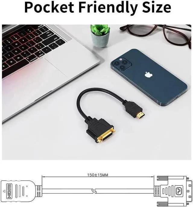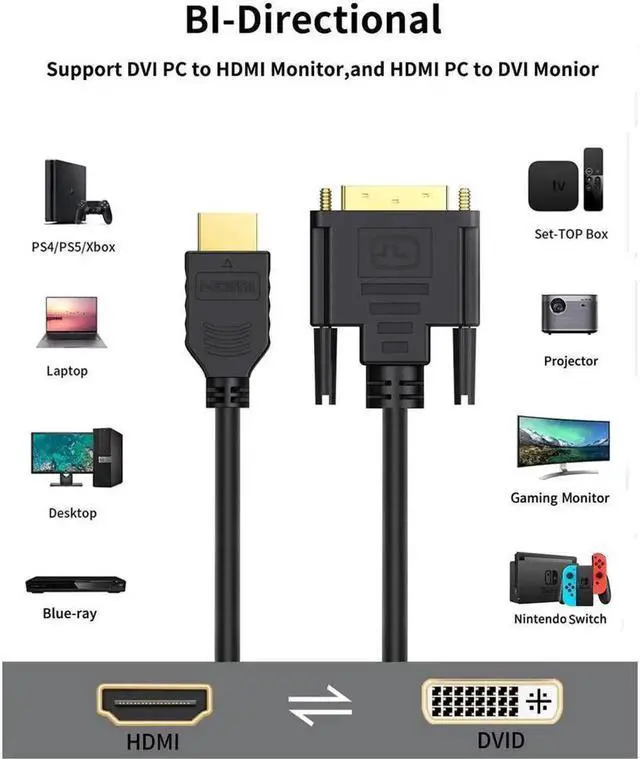 This short 0.5ft HDMI to DVI cable provides bi-directional signal conversion between HDMI and DVI-I (24+5) interfaces. It supports clear 4K and 1080P video transmission without lag or distortion. The compact length keeps your setup clean and perfect for tight spaces. Plug-and-play with no drivers needed, widely used for connecting computers, game consoles, players to monitors and HDTVs.