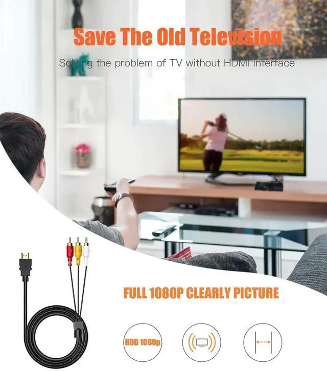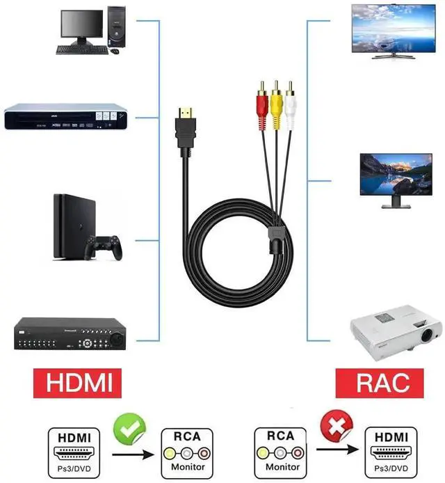 This 5ft HDMI to 3-RCA cable is designed for connecting HDMI-output devices to RCA AV equipment. It features gold-plated connectors to ensure stable audio and video transmission. Please note this cable does not convert digital to analog signal on its own and only works with devices that support direct signal transfer. Ideal for home theater setups, DVD players, TVs, and projectors.