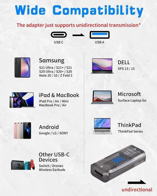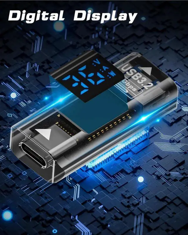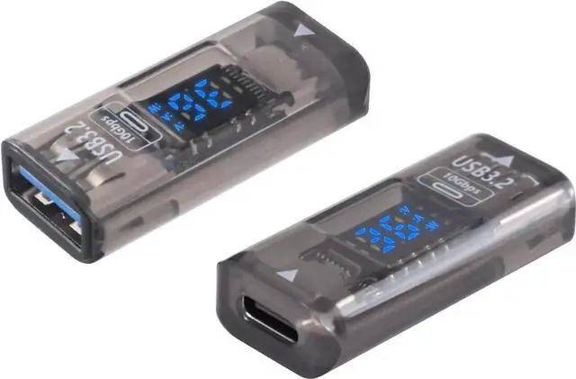 This USBC female to USBA female adapter supports 10Gbps high-speed data transmission and fast charging. It features a clear LED digital display that shows real-time voltage and current, helping you track power status safely. The durable and compact design allows seamless connection between USBC and USBA devices. Perfect for iPhones, Galaxy phones, laptops, power banks, and external storage. Plug-and-play with no drivers required. Comes in a 2pack for daily use and backup.