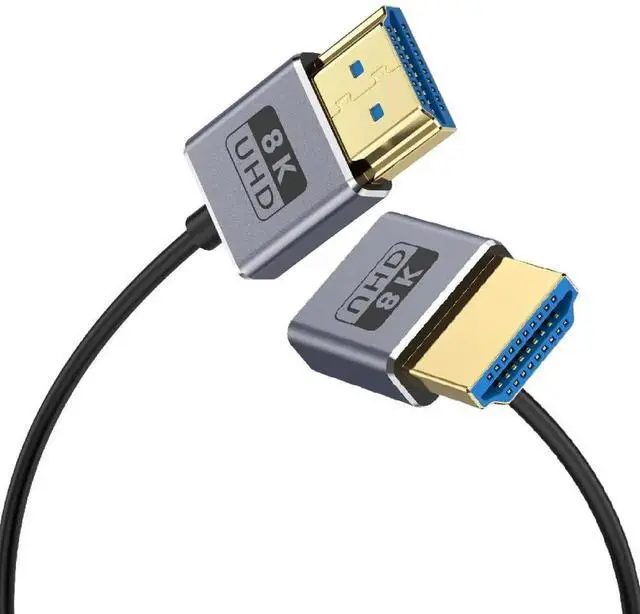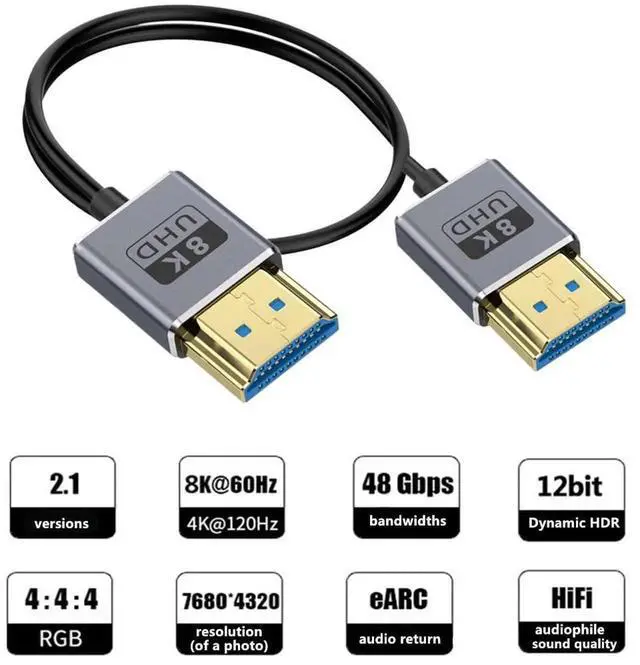 This 1foot ultrathin HDMI 2.1 cable features a slim 2.5mm outer diameter and an upwardangled connector, perfect for compact camera rigs, wallmounted TVs, and tight gaming setups. It delivers 48Gbps highspeed transmission supporting 8K@60Hz, Dynamic HDR, and eARC for professional video and immersive audio. Goldplated connectors and stable coaxial design ensure no signal loss or interference. Plugandplay compatibility with GH5S, PS5, Xbox One, cameras, monitors, and HDTVs.