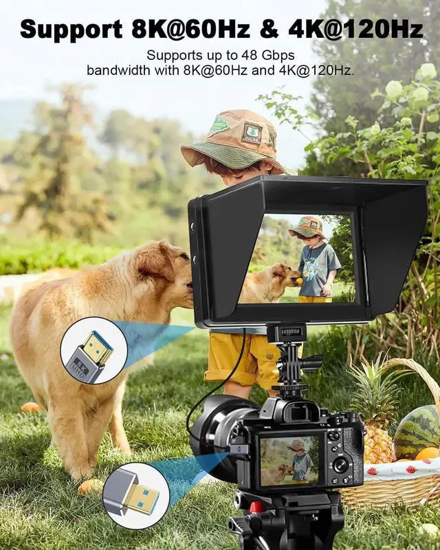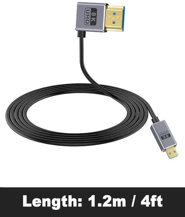 This high-speed Micro HDMI to HDMI 2.1 cable features a spacesaving downangle connector and supports 8K@60Hz / 4K@240Hz ultrahighdefinition video with 48Gbps bandwidth. Goldplated contacts ensure stable signal transmission for photography, live streaming, gaming and compact device setups.