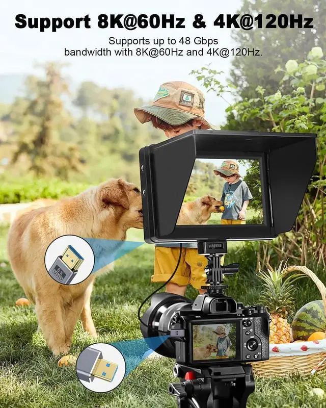 This high-speed Micro HDMI to HDMI 2.1 cable supports 8K@60Hz and 4K@240Hz ultra-clear video with 48Gbps bandwidth. The down-angle design saves space and improves wiring for Raspberry Pi, action cameras and DSLRs. Gold-plated connectors ensure stable transmission for photography, live streaming and gaming.