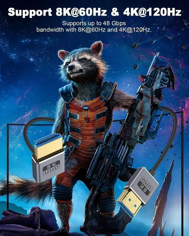 This ultra-thin 90° up-angle HDMI 2.1 cable provides 48Gbps ultra-high-speed transmission for sharp 8K@60Hz and 4K@240Hz video. Its slim 2.5mm diameter and upward angled design are perfect for GH5S cameras, PS5, Xbox, PCs, and monitors in tight spaces. The short 1ft length ensures a clean, professional setup for gaming, live streaming, and external display.