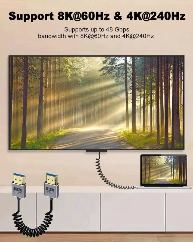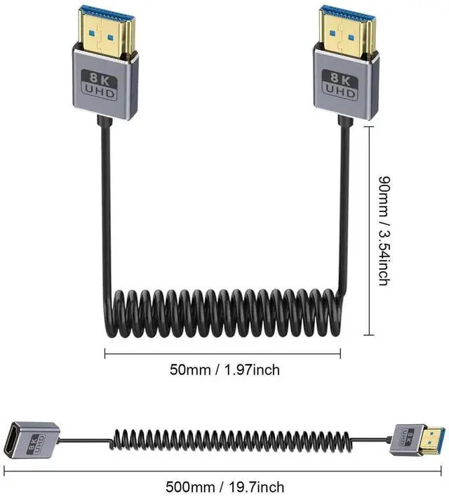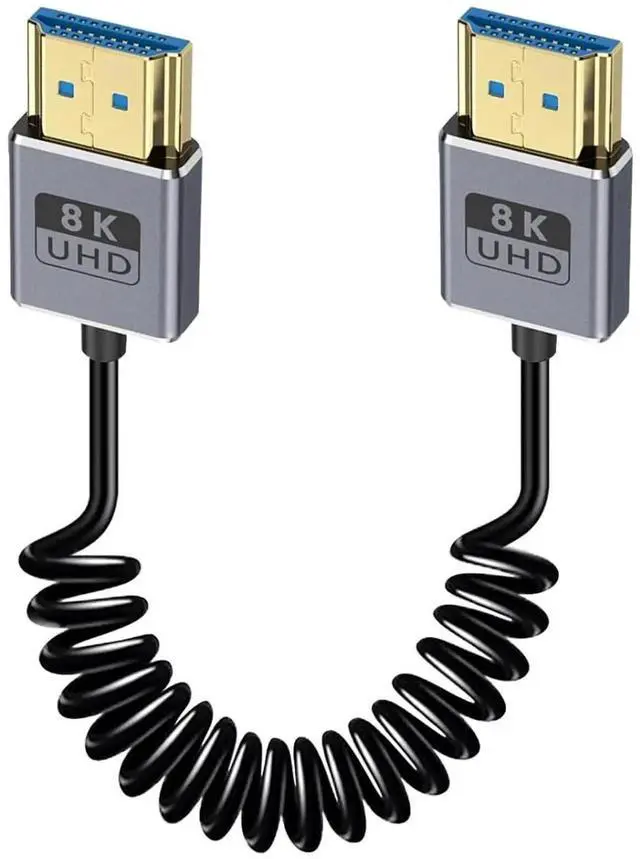 This ultra-thin coaxial coiled HDMI 2.1 cable delivers flagship 8K@60Hz and 4K@240Hz performance with 48Gbps high-speed transmission. Its stretchable short-length design fits compact spaces while maintaining strong signal stability. Ideal for professional camera monitoring, gaming consoles, streaming devices and home theater setups.