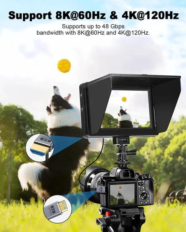 This 1FT/30cm ultra thin coaxial down-angle HDMI to Mini HDMI cable adopts HDMI 2.1 technology with 48Gbps high-speed transmission, supporting 8K@60Hz and 4K@240Hz video. The down-angle elbow design saves space and fits compact shooting and display setups. Perfect for cameras, camcorders, tablets, laptops and Raspberry Pi Zero with stable and clear audio-video output.
