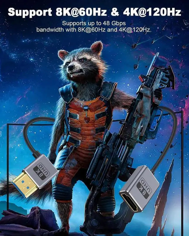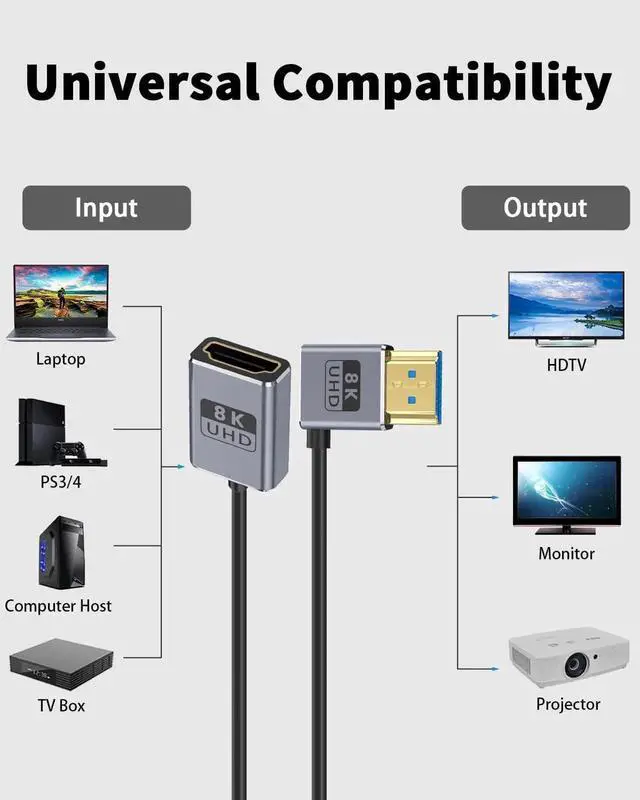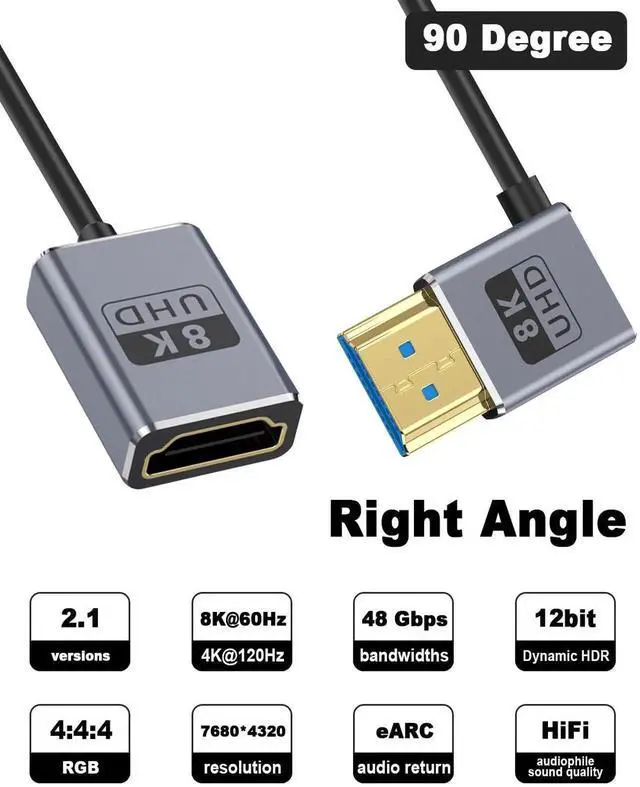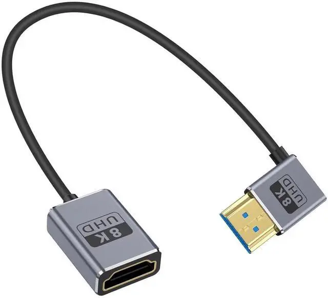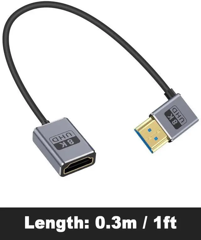 This 1FT down-angle HDMI extension cable supports full HDMI 2.1 specification with 48Gbps ultra-high speed, enabling 8K@60Hz and 4K@240Hz high-refresh video. The 90° downward connector saves space and fits compact camera, gaming, and monitor setups. Plug-and-play with stable transmission for GH5S, game consoles, computers and home theater devices.