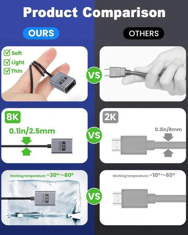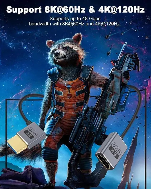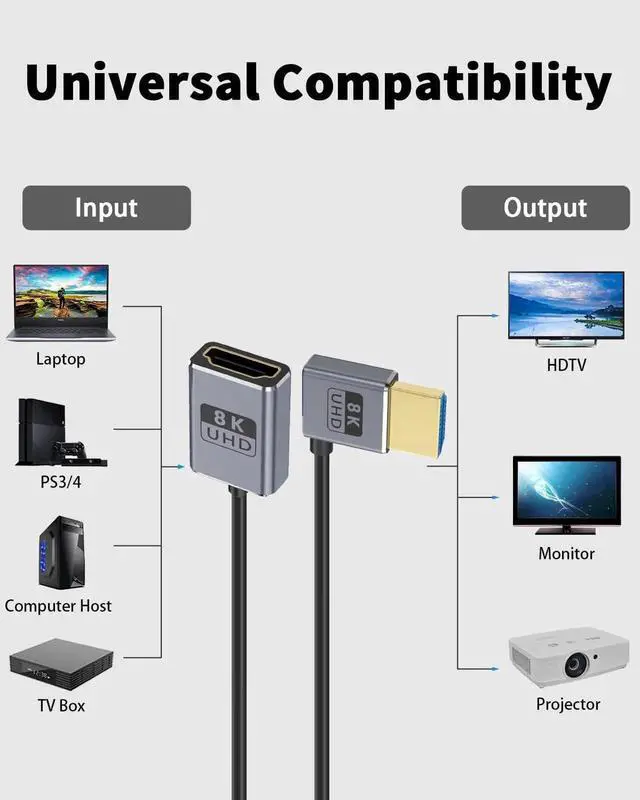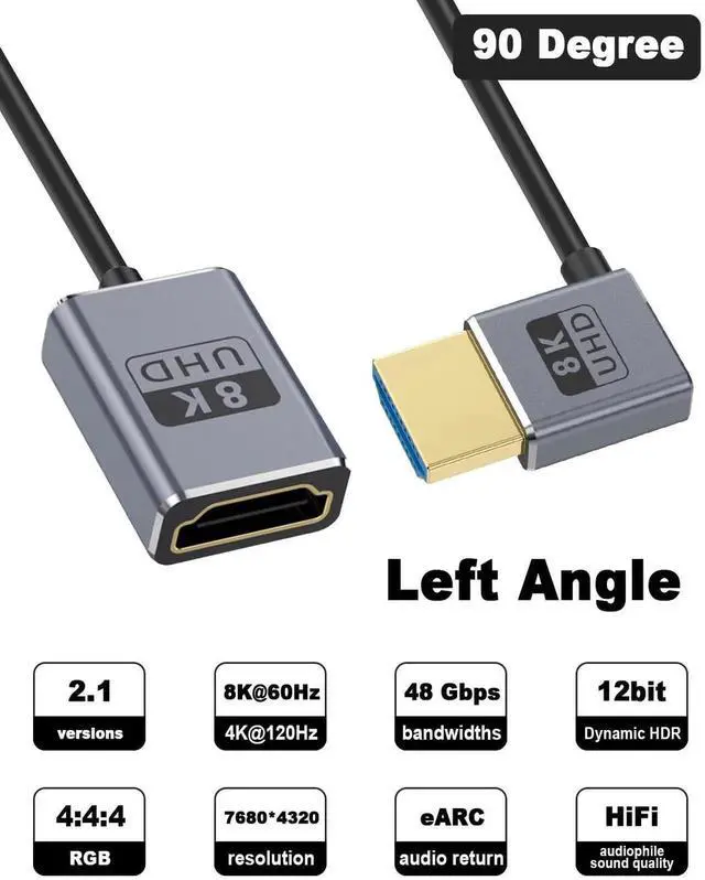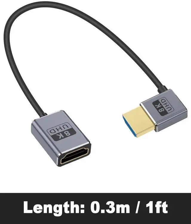 This 1FT down-angle HDMI extension cable supports full HDMI 2.1 specification with 48Gbps ultra-high speed, enabling 8K@60Hz and 4K@240Hz high-refresh video. The 90° downward connector saves space and fits compact camera, gaming, and monitor setups. Plug-and-play with stable transmission for GH5S, game consoles, computers and home theater devices.