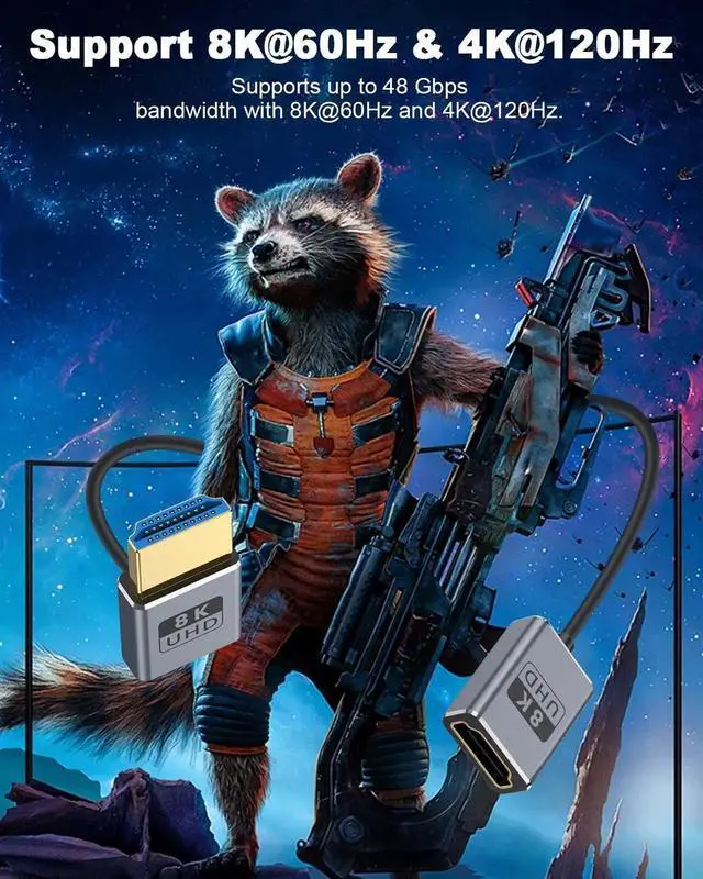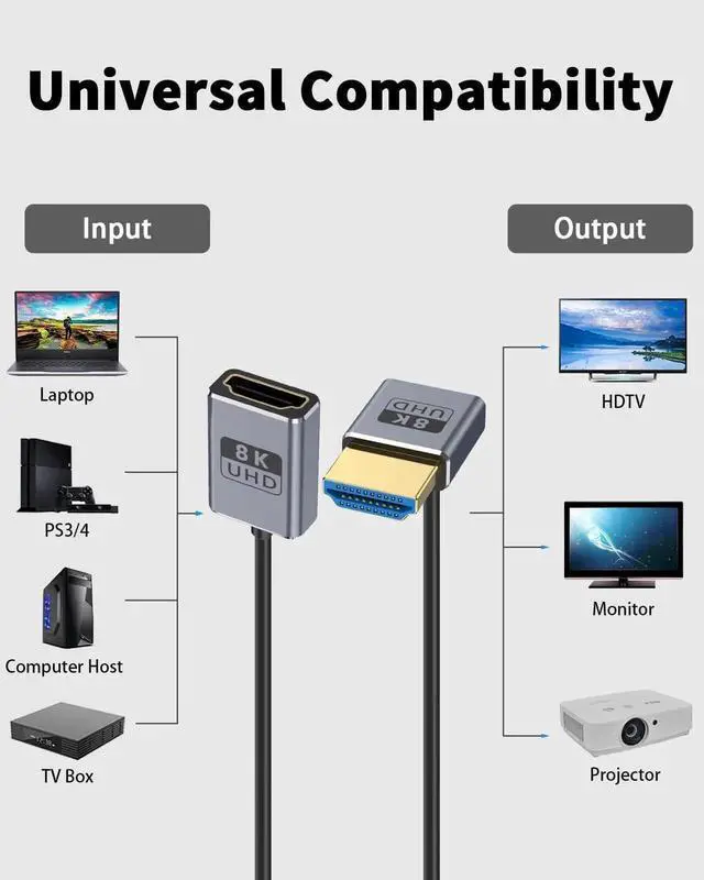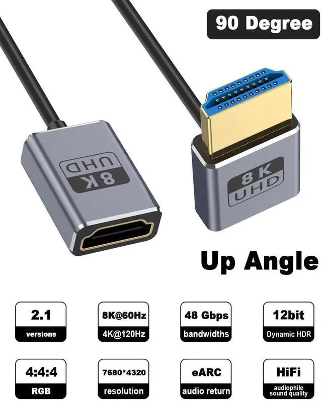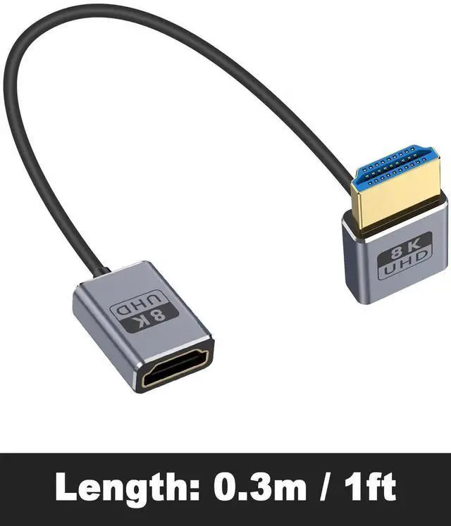 This 1FT down-angle HDMI extension cable supports full HDMI 2.1 specification with 48Gbps ultra-high speed, enabling 8K@60Hz and 4K@240Hz high-refresh video. The 90° downward connector saves space and fits compact camera, gaming, and monitor setups. Plug-and-play with stable transmission for GH5S, game consoles, computers and home theater devices.