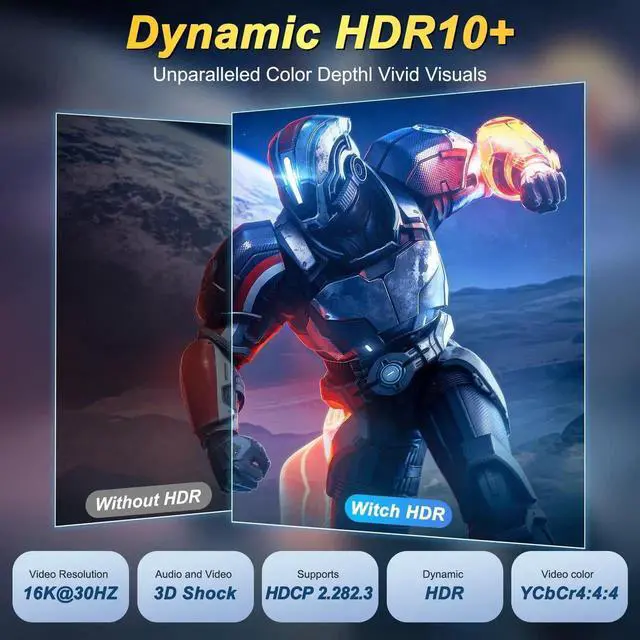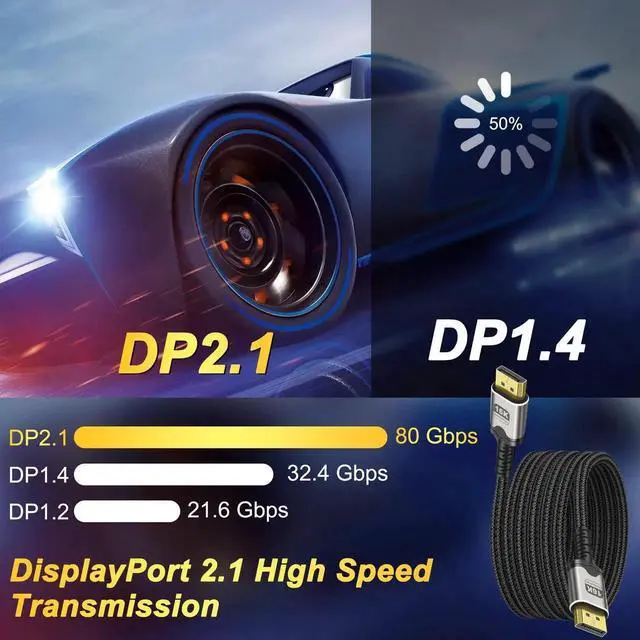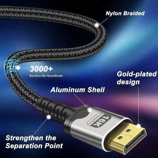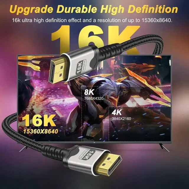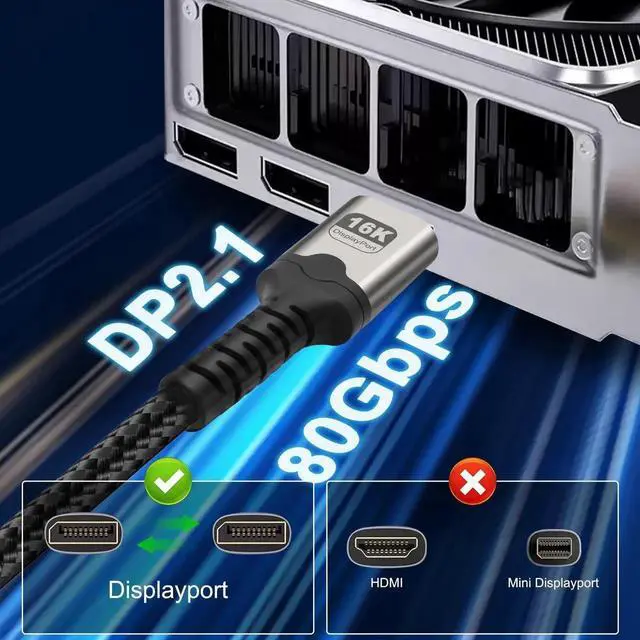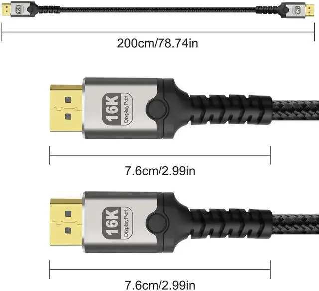 This 2M/6.6Ft DisplayPort 2.1 cable delivers 80Gbps ultra-high-speed transmission to unlock 16K@60Hz and 4K@240Hz visuals. It supports HDR, HDCP and DSC for sharp, smooth images with low latency. The braided design ensures stable, interference-free signal, ideal for high-refresh gaming monitors, high-end GPUs, home theater and multi-display workstations.