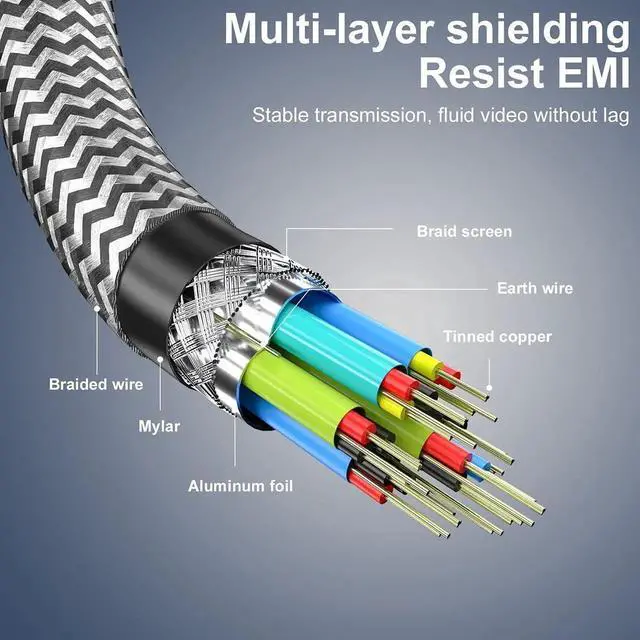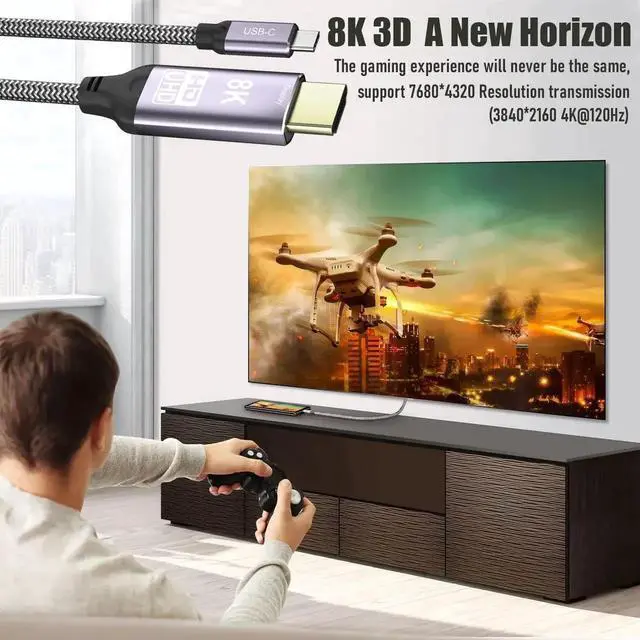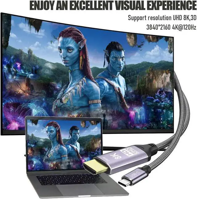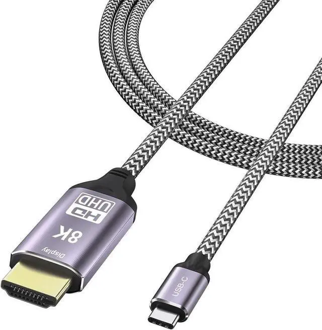 This USB-C to HDMI 2.1 cable supports up to 7680×4320 8K@30Hz and 4K@120Hz with HDR, delivering ultra-clear picture quality at 48Gbps high speed. It works with Thunderbolt 3 laptops, phones, tablets and other USB-C devices to connect HDTVs, monitors and projectors. The 1.8m length offers flexible layout for home theater, gaming, office display and multimedia use.