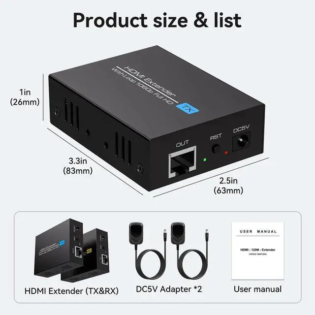This 400ft/120m HDMI over Ethernet extender kit transmits full HD 1080P@60Hz and 3D video signals over standard Cat5/Cat6 network cables with zero latency. It features a convenient loop output for local display and automatic EDID function to ensure wide compatibility with different source and display devices. Offering stable long-distance transmission, this balun set is ideal for home theaters, classrooms, conference rooms, shopping malls, and large-scale AV installations.