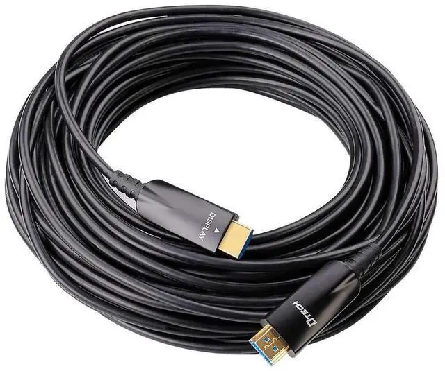This 100ft black fiber optic HDMI cable delivers reliable high-speed transmission for crisp 4K@60Hz and 1080P HD video with support for 3D content. Built with fiber optic core, it ensures strong anti-interference performance and zero signal loss over long distances. It supports HDCP for protected media playback and CEC for convenient one-remote device control. Ideal for home theaters, in-wall installations, classrooms, and auditoriums. Plug-and-play design works with TVs, projectors, monitors, laptops, DVD players, and gaming consoles.